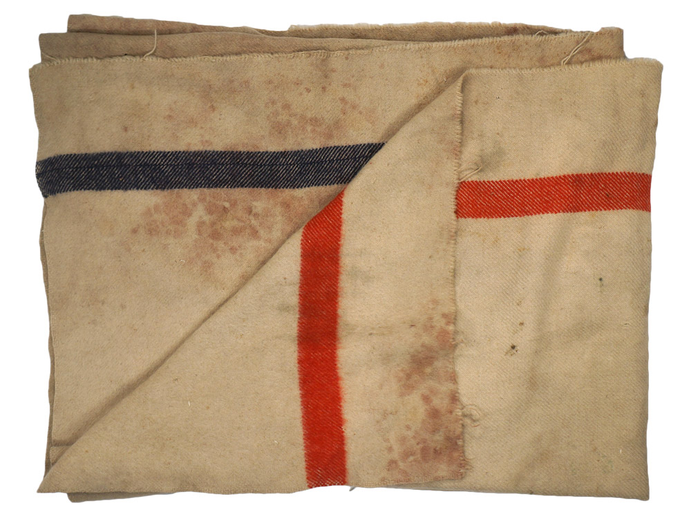 An off white, wool blanket that measures approximately 142cm x 238cm with a blue 5cm wide stripe to one end and a red 5cm wide stripe to the opposite end. The blanket shows moderate/heavy usage and wear with stains, mothing, and holes.