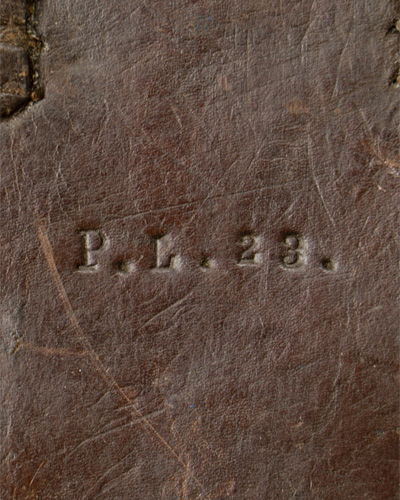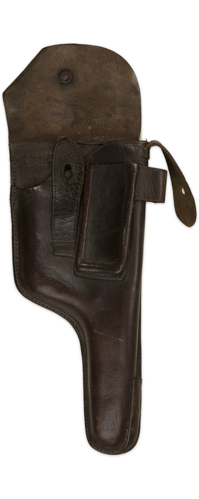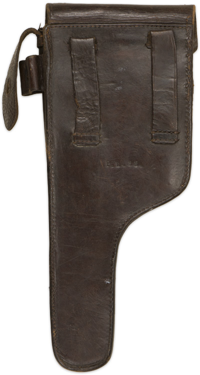 PHYSICAL DESCRIPTION: Brown leather holster with top fold-over flap is sewn along its reverse to the back of the holster body, and has steel stud to its forward edge. Mating with this stud is a 10cm tall, vertical strap with a stud hole. Single, open-topped magazine pocket sewn to the front of the holster body. Straps and pocket for the cleaning tool are still present. Original belt loops are complete. Reverse is marked "P.L. 23". Shows the expected period use and wear but overall nice condition. This one I think is 1920's.