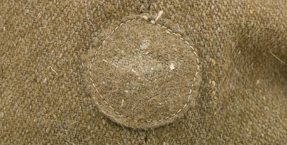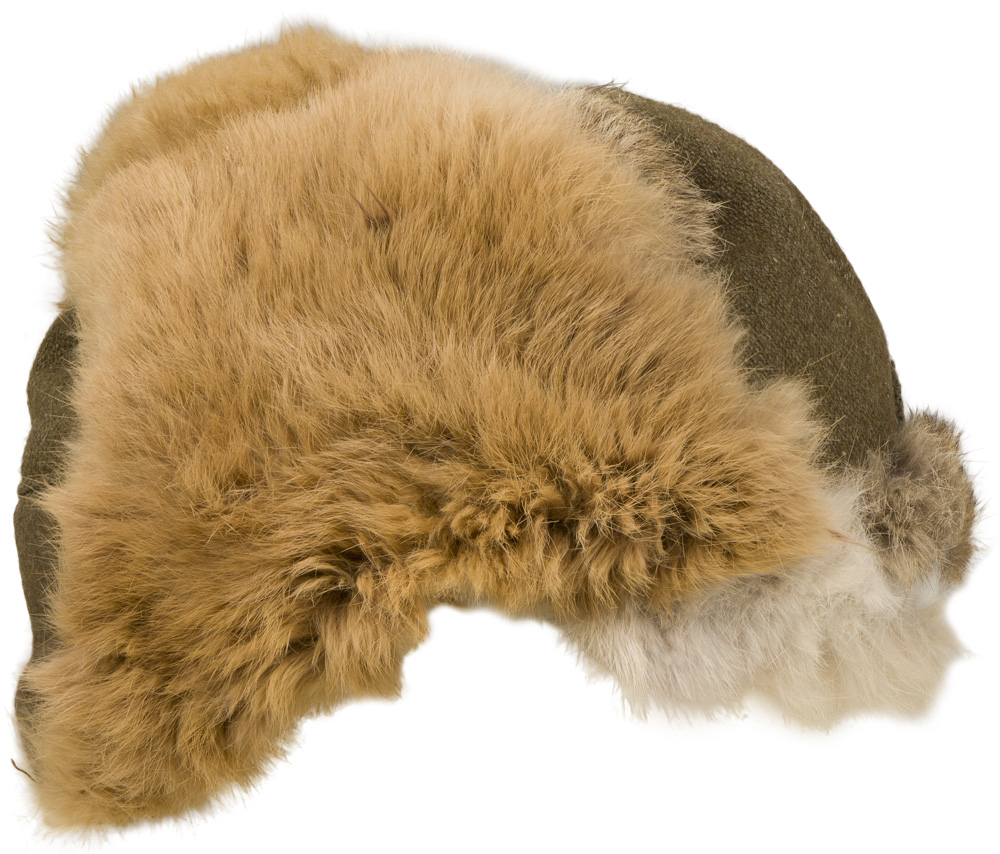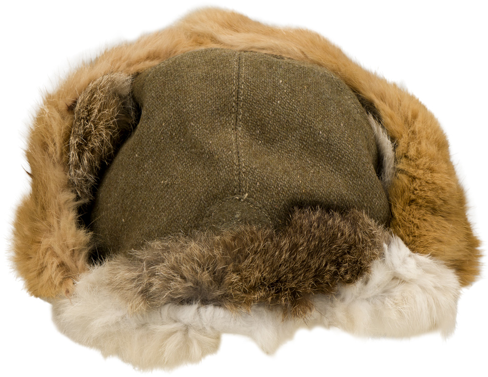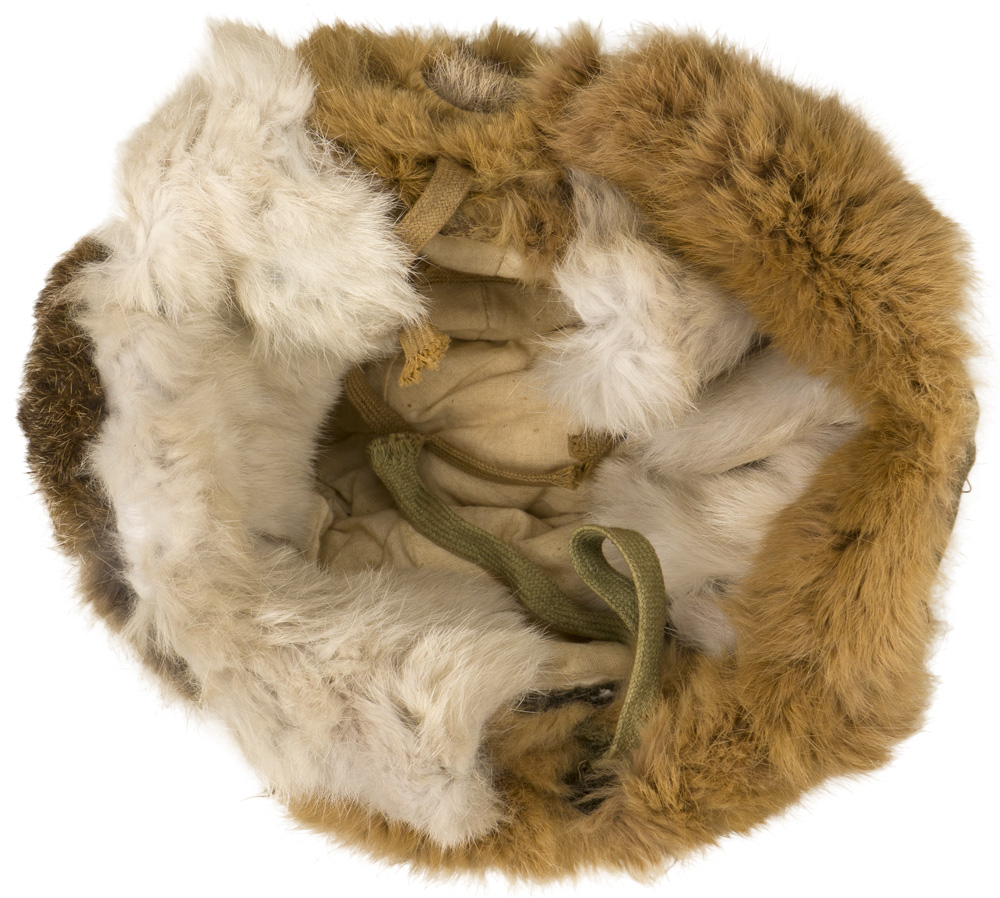 A standard pattern cap as issued to Japanese troops for cold weather conditions. Its exterior crown is comprised of six triangular sections of olive drab wool which meet at a wool-covered "button" to its apex. mall, "D"-shaped flaps of the same material are sewn along the seam to the base of the sections above each ear. Beneath these extend olive drab wool panels which cover the ears, are joined by another panel along the back of the neck, and could be fastened under the chin to the front. A circular hole for each ear is cut into each of these panels, which could be covered by the aforementioned small flaps. Each of the small flaps have rabbit fur lining their interiors and have olive drab loops to their outside edges. These loops mate with either the buttons sewn to each side of the crown, or the buttons sewn below each of the circular openings to the lower panels. A button is also sewn forward of each of the ear openings. A pair of ties are sewn to each side to the interior, with one being almost torn in half. The interior is lined in white cotton that bears an ink stamp. To the front of the cap, upon the olive drab wool base, the outline of the five pointed star can faintly be seen, as it has been removed. The wool is in good condition with typical wear and knapping, with the fur being in very good condition.