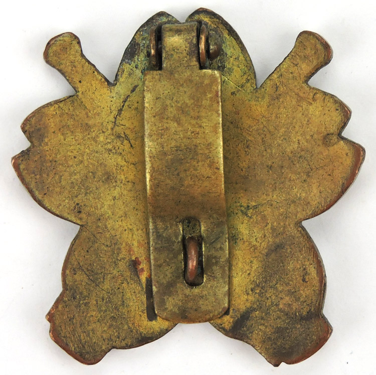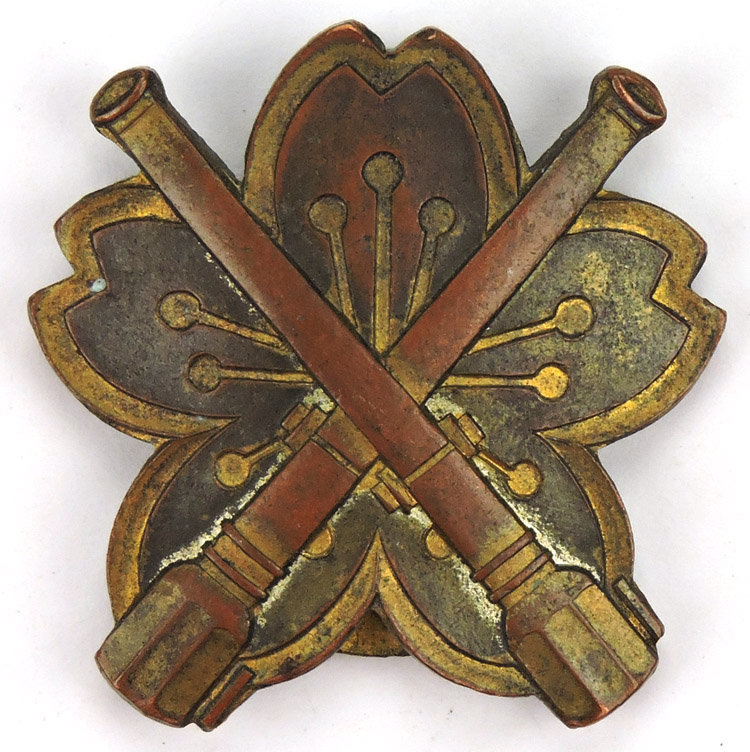 An brass/tombak constructed badge that takes the form of a convex five petal cherry blossom measuring 40mm across with two cannons crossed to the center. The reverse, which is flat, has a hinge with a broad flat pin whose perforated end mates with an "eye". Scarce.