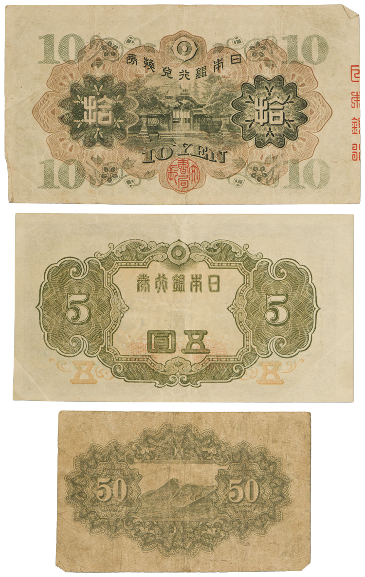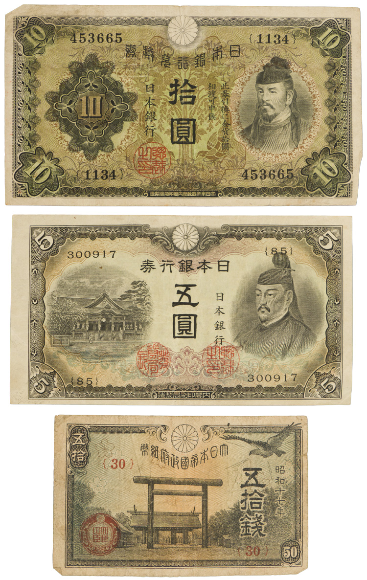 A group of 3 individual banknotes. 10 Yen, 5 Yen and 50 sen.