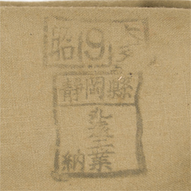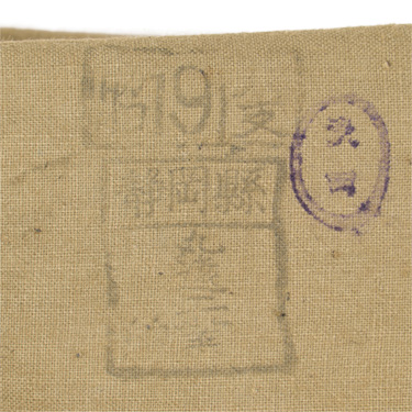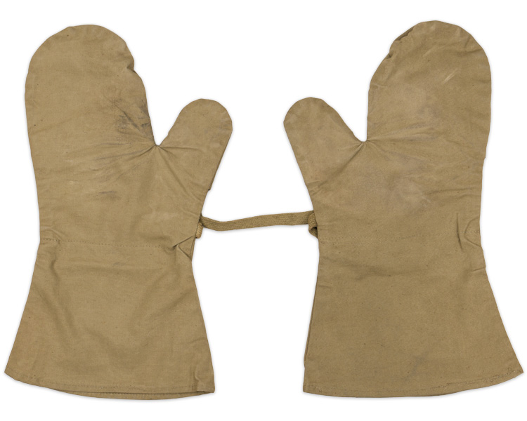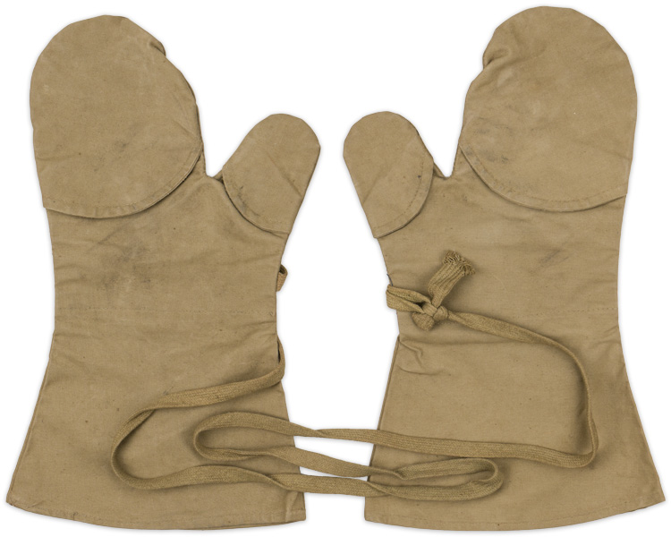 A pair of khaki-colored canvas mittens which feature access slits at the base of the fingers and thumb where they meet the palm. A cloth strap extends from the outside base of the thumb to one mitten and a short loop extends from the same position to the other. Nicely marked, excellent condition.