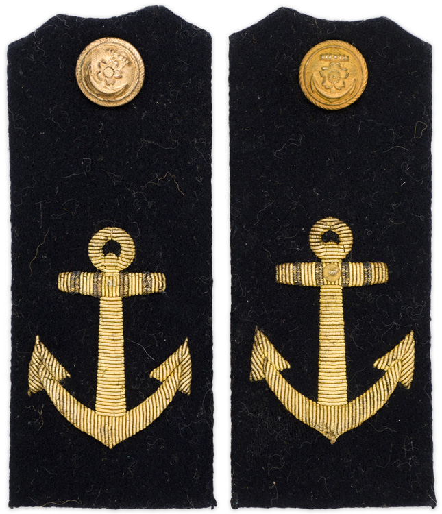 A pair of stiffened, black wool shoulder boards featuring a embroidered gilt wire anchor. The reverse is covered with a leather that has a metal alloy slider attached.