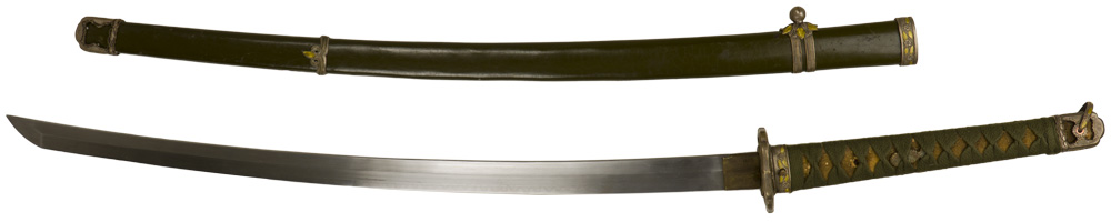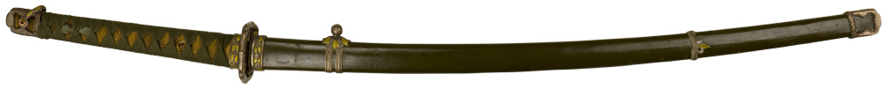 BACKGROUND: The sword is said to symbolize the spirit of the Japanese warrior from time immemorial. It came to be regarded as a representation of the samurai’s "Bushido," or code of honor. In the late nineteenth century, the samurai class were all but disbanded, and with them their traditional "Tachi," or slung sword, passed out of common usage. The swords adopted by the Japanese military after this period reflected the design influence of their European advisors. The pre-war military incursions into Manchuria and China inspired a Japanese nationalism that led, in 1933 or 1934, to the return to the Tachi design, then referred to as the "Shin-gunto" (neo-army sword). It was to become the most commonly encountered Japanese military sword and was produced and used until the end of the second world war.