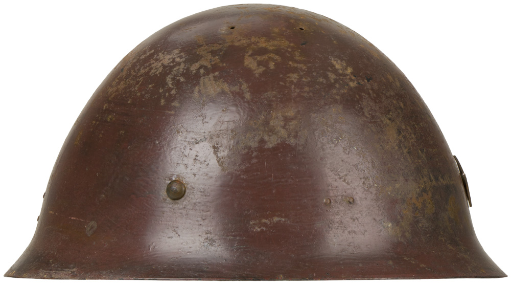 The standard WWII Japanese infantry combat helmet. The shell, constructed from chrome polybend steel retains a good portion of its original paint. The original IJA metal star affixed to the front. Helmet has a replaced, modern liner in it. Shell is really quite decent, it deserves to have an original liner put back in it!