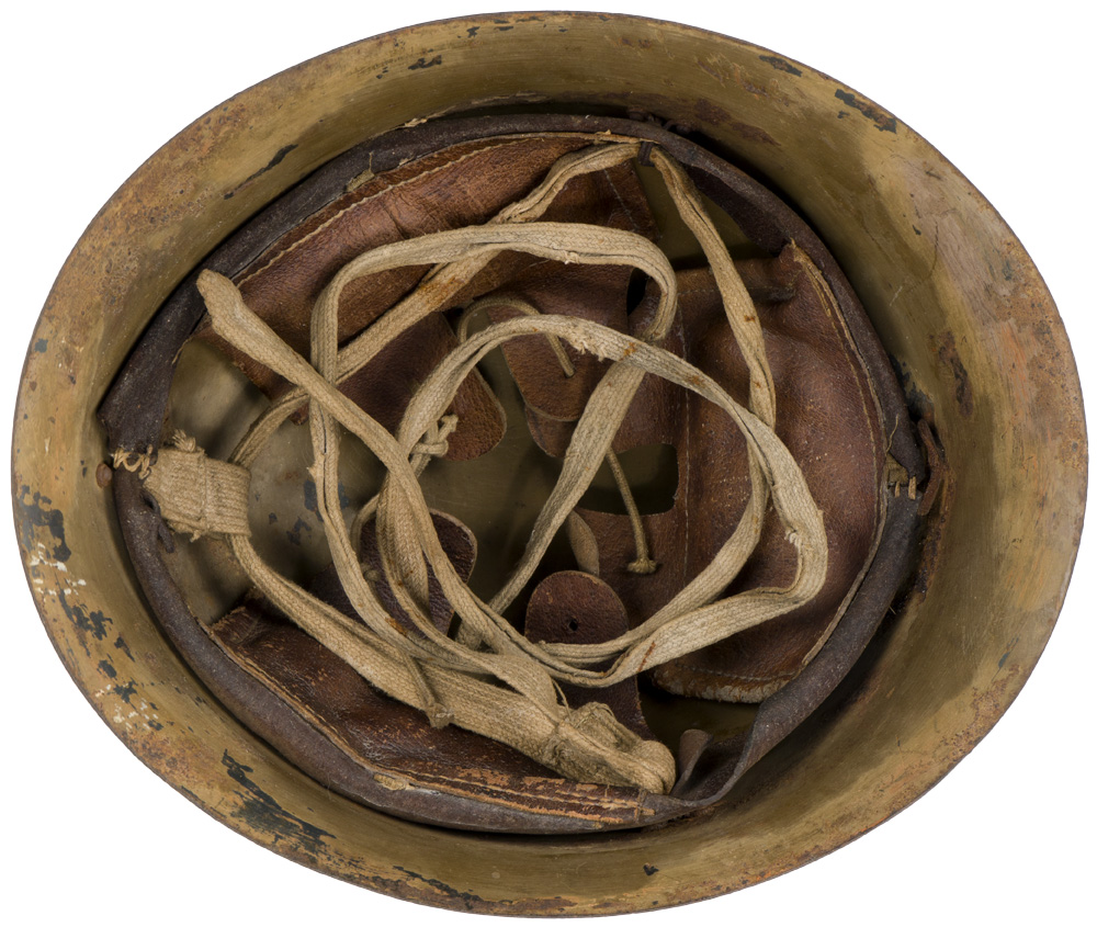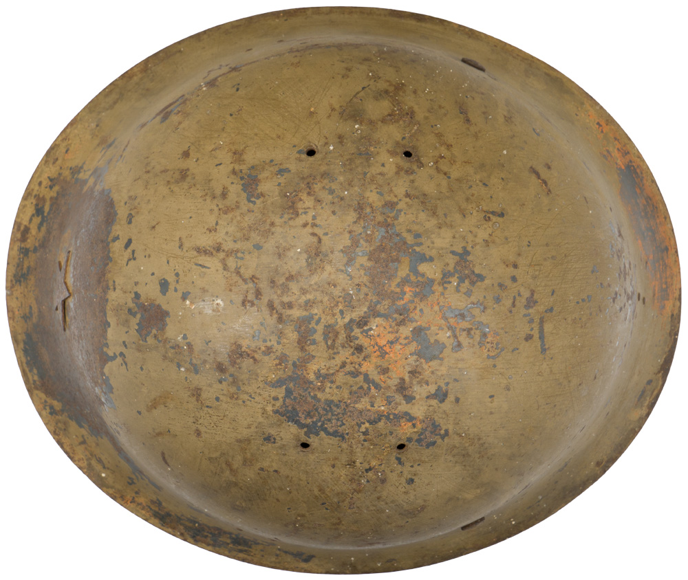 The standard WWII Japanese infantry combat helmet. The shell, constructed from chrome polybend steel retains a good portion of its original paint. The original IJA metal star affixed to the front. The original three pad pigskin liner and band is complete. The helmet is complete with its original cloth chinstrap and all rivets and rings. Well worn and used example.