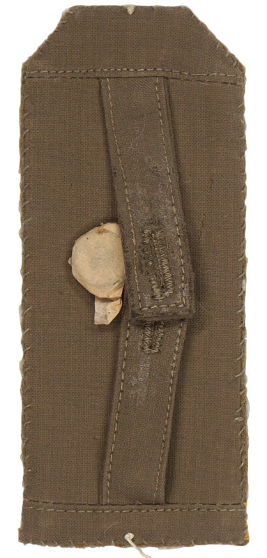 A khaki wool strap measuring approximately 5.5cm x 12cm with a single button with a five petal chrysanthemum to its surface, two, five pointed stars with a gold tress to the bottom. The reverse has a cotton backing with a buttoned strap. Very nice clean example.