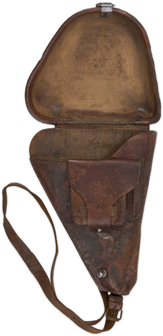 Early reddish brown, leather, hard shell holster for the type 14. 8mm Nambu pistol. The hard shell fold over flap is attached to its top by a sewn leather hinge. Original shoulder strap. All complete and in nice condition.