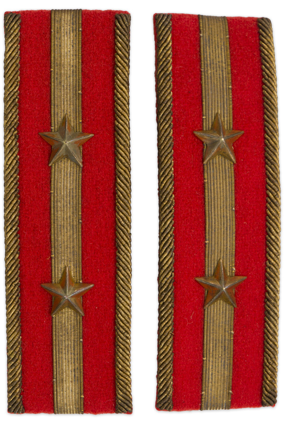 The "Type 5" (5th year of the Showa era, or, 1930) rank insignia were worn on the shoulders of the uniform, as that model’s stand up collar featured the arm of service colors and regimental numerals. Red wool tab with gold tress, twisted bullion trim and