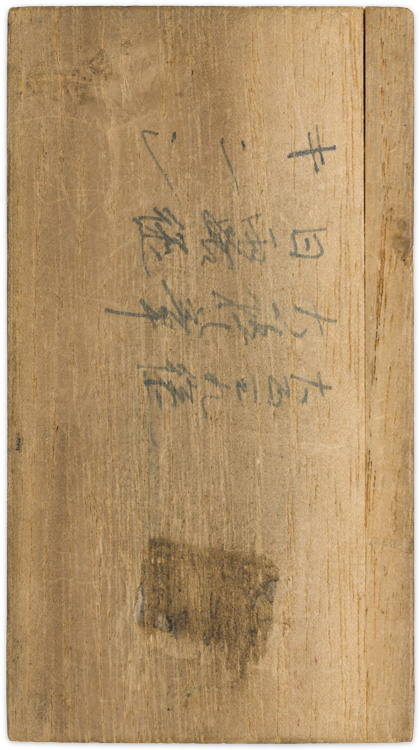 An approximately 6cm x 10.5cm softwood example. The case, which separates along its sides, has a vertical series of eight kanji characters, stamped in gold, to its cover. The base of the interior is lined in a red velvet like material and is molded to accommodate the medal and its ribbon.