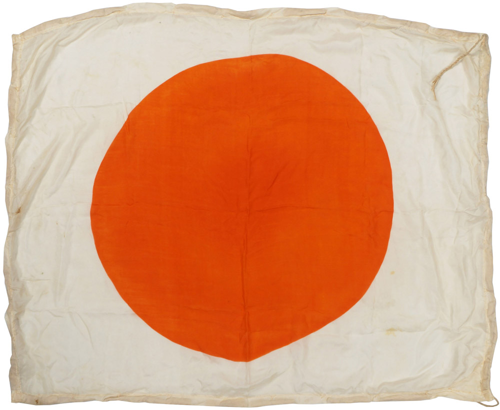 An approximately 74cm x 100cm, fine white silk flag with a 60cm diameter red "Himaru" printed to its center. Short, white cotton tie-cords are to two of its corners, where triangular reinforcements may also be seen, and a tunnel loop runs along all of its sides, within which are evenly distributed sections of buoyant kapok (the same material used in their life-jackets). Several small picks to the material, and some light stains, are noticeable. Of Note: Used as a marker for downed airmen, these light weight, thin silk flags required almost no space to store, and were normally carried in the special pocket found to the lower right front panel of most life-jackets.