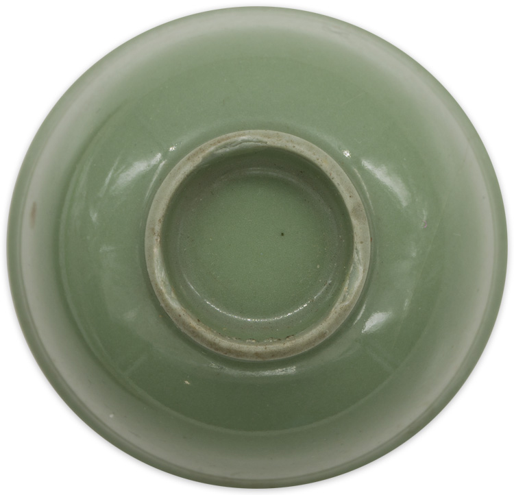 A celadon porcelain construction sake cup with gilt rim. The cup has a 55mm diameter.