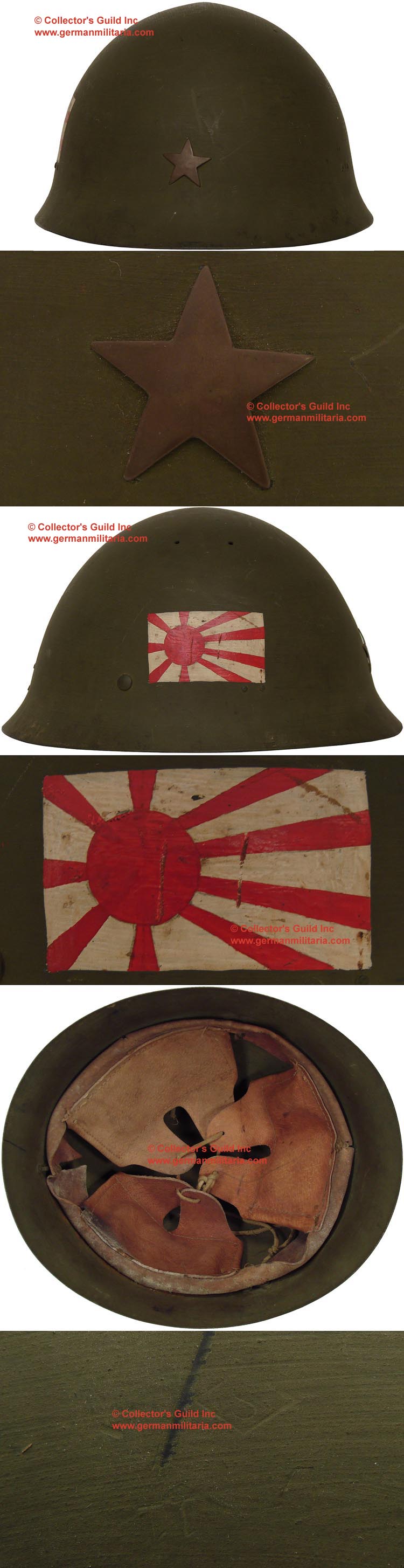 Standard WWII Japanese infantry combat helmet, whose shell, constructed from chrome molybend steel, retains about 99% of its exterior matt finish olive drab paint. To the right side of the helmet is a hand painted "Rising Sun" flag (most probably vet done). The Imperial Japanese Army five-pointed star affixed to its front had been painted the same as the shell. Nice complete liner. Cloth chinstrap is missing. Shell size large. Very nice, clean, helmet.GRADE ****1/2 PRICE $