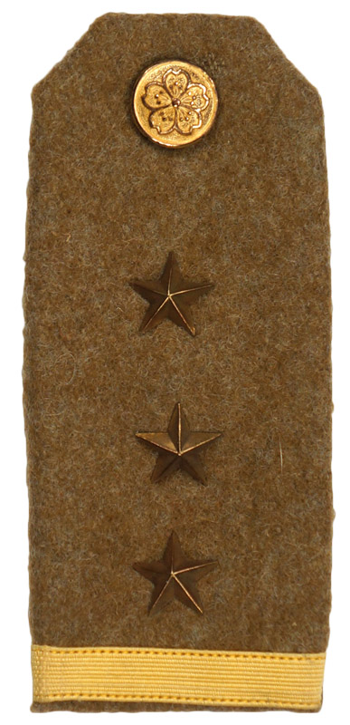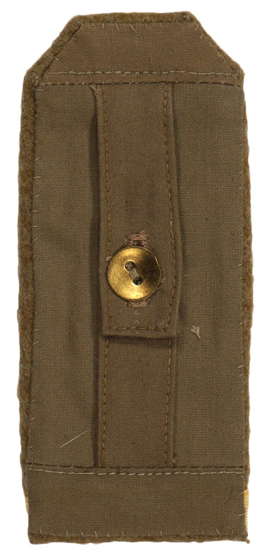 A khaki wool strap measuring approximately 5.5cm x 12cm with a single button with a five petal chrysanthemum to its surface, three, five pointed stars with a gold tress to the bottom. The reverse has a cotton backing with a buttoned strap. Very nice clean example.
