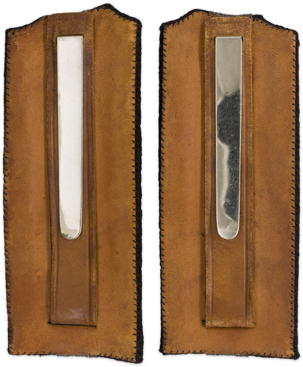 A pair of stiffened, black wool shoulder boards featuring a golden tress stripe and two silver metal alloy "pips" in the shape of a five petal cherry blossom are sewn to the black wool background with a brass Naval button to one end. The reverse is covered with a leather that has a metal alloy slider attached.