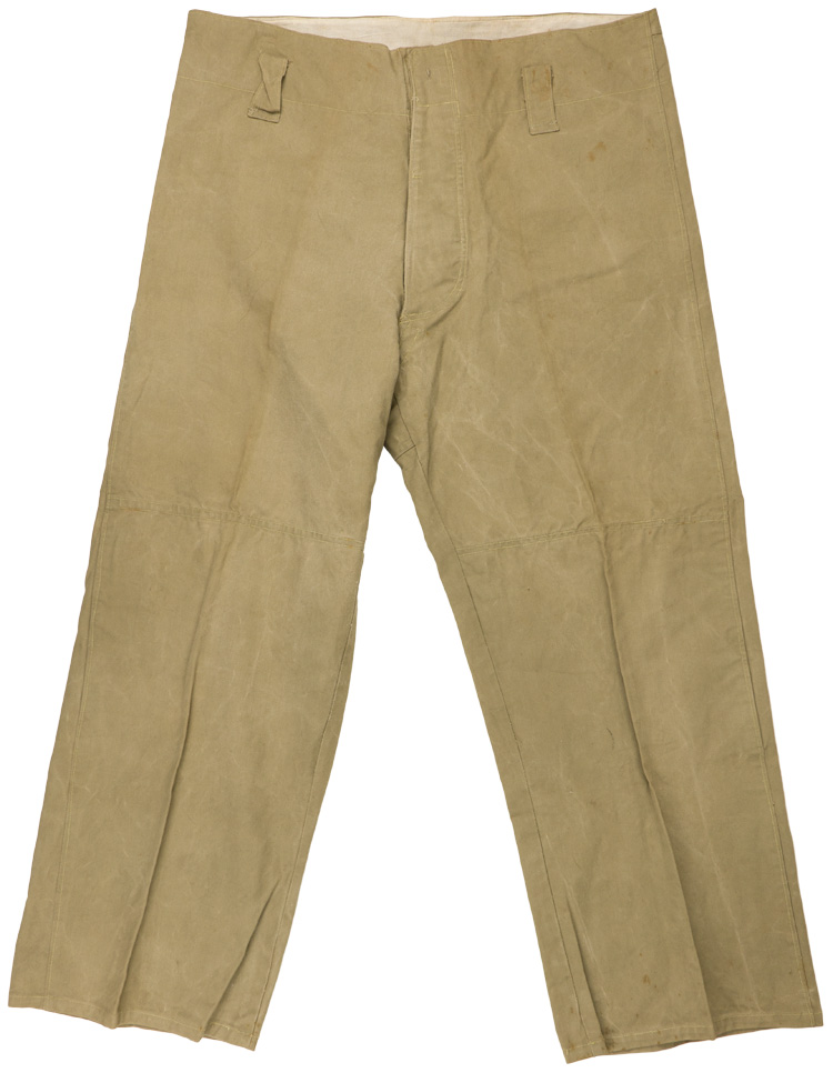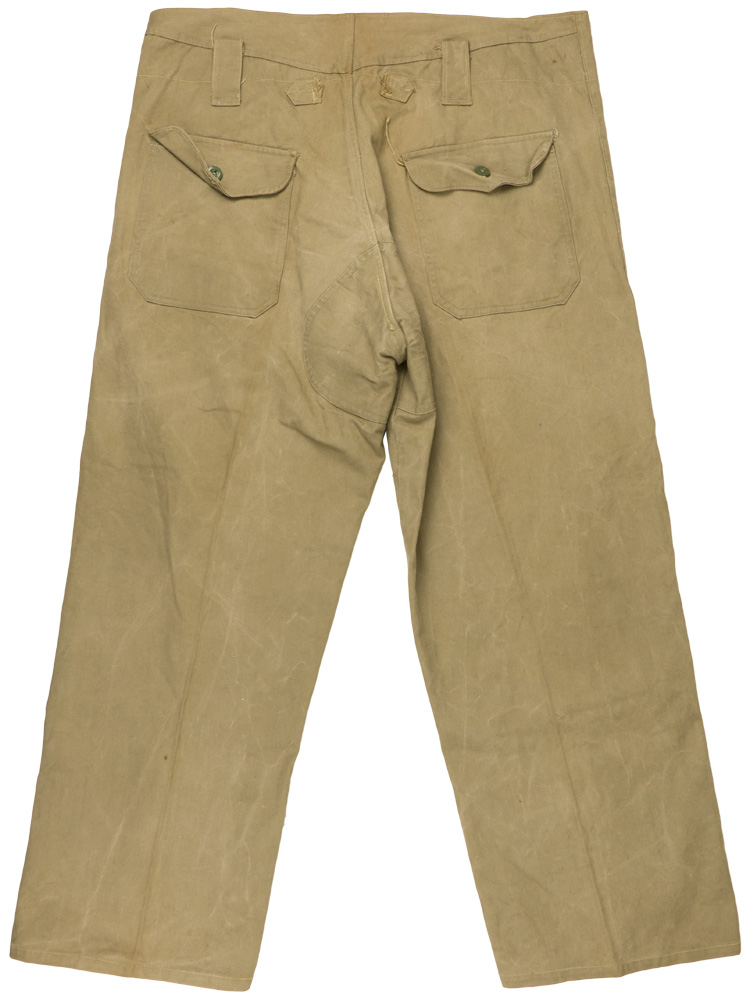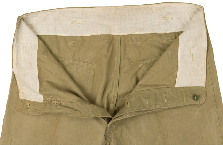 The olive drab-colored, light weight cotton, straight-legged trousers have a three button French fly, with an additional button to the waist, two horizontal slash patch pockets to the rear, each of which has a buttonhole mating with a button, and four belt loops. The buttons to the rear pockets and the fly are all the same size and are of dark green bakelite. The adjustment strap to the rear of the trousers is not present. The seat of the trousers and the knee area have reinforced stitched panels to them. The waist measures approximately 36" with a breech of 25.5". The seams show wear, but overall a very nice, clean pair of trousers.
