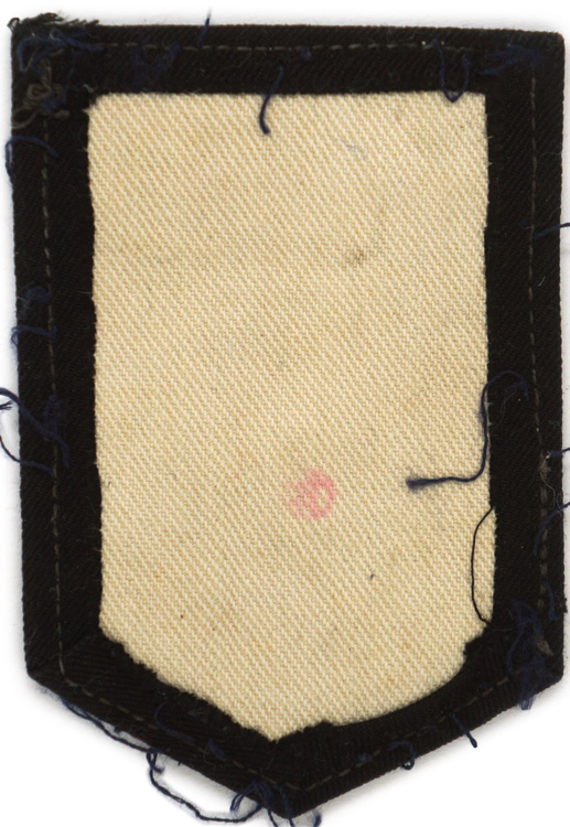 A 5cm x 7cm black patch, coming to a point at its base, upon which is machine woven, in yellow, three horizontal bars above a stylized anchor. A small hole is between the bars and the anchor, where an alloy cherry blossom would have been affixed. A white backing is to the reverse that has a small red ink stamp to it. This insignia, which would originally have been worn on the upper right sleeve, signified the rank of a first class leading seaman.
