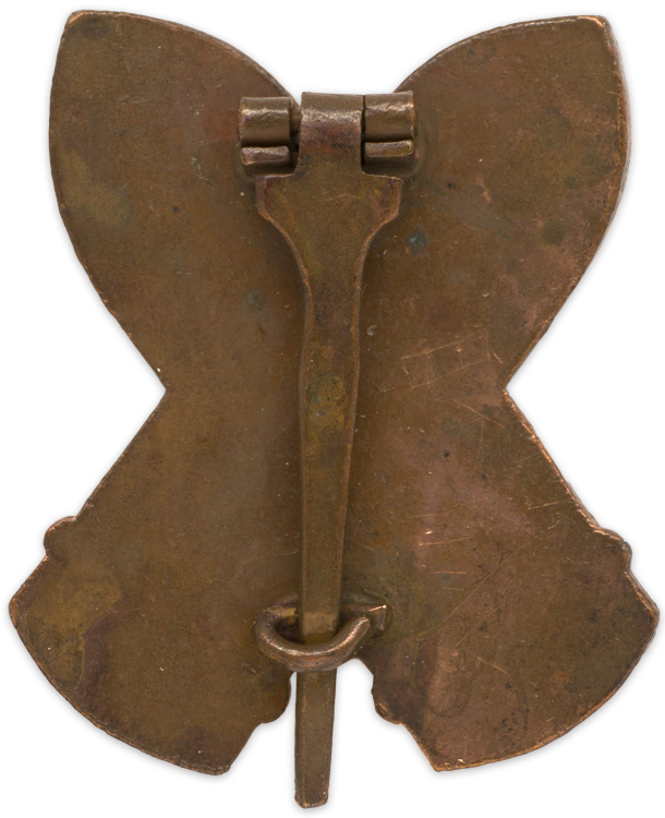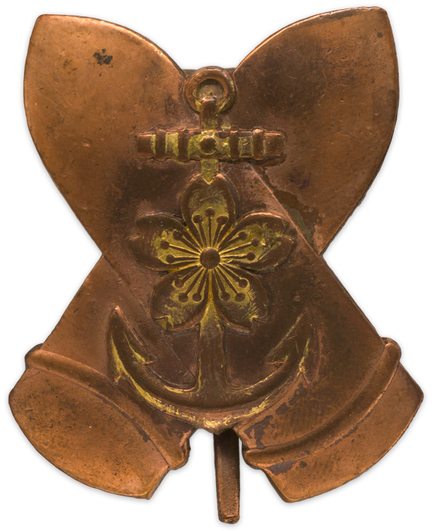 A badge that takes the form of two crossed Navy artillery shells with a cherry blossom and anchor affixed to the center. The badge measures approximately 30mm x 37mm and is complete with original hinged, tapered pin and catch device. Catch is bent in the closed position.