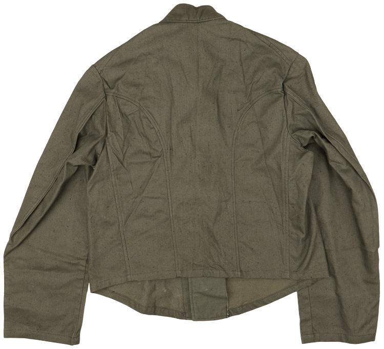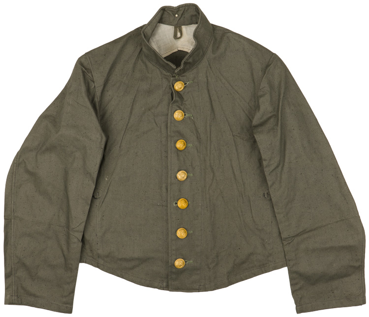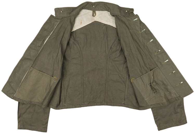 An unlined, waist length, light olive drab cotton tunic, with a seven button, single-breasted front closure and a stand-up collar. Dual hooks are along one leading edge of the collar, and corresponding eyes are along its other edge. All original buttons. Approximately a size 30". Nice markings.
