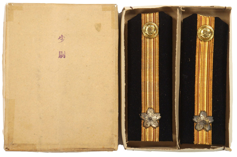 A pair of stiffened, black wool shoulder boards featuring a golden tress stripe and a silver metal alloy "pip" in the shape of a five petal cherry blossom are sewn to the black wool background with a brass Naval button to one end. The reverse is covered with a leather that has a metal alloy slider attached. Comes with its original cardstock case.