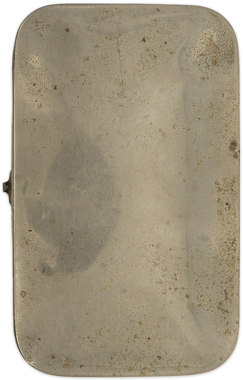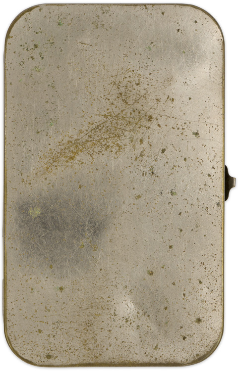 A pair of service dress shoulder boards in the original sheet metal, hinged and lined case. Comprised of interwoven golden-yellow cords, with a plain, golden-coloured alloy button to one end. The undersides of the boards are lined in black wool with hinged sliders. The case has a red velvet lining to the interior that is divided into two sections. The case measures approximately 15.5cm x 10cm x 4cm.