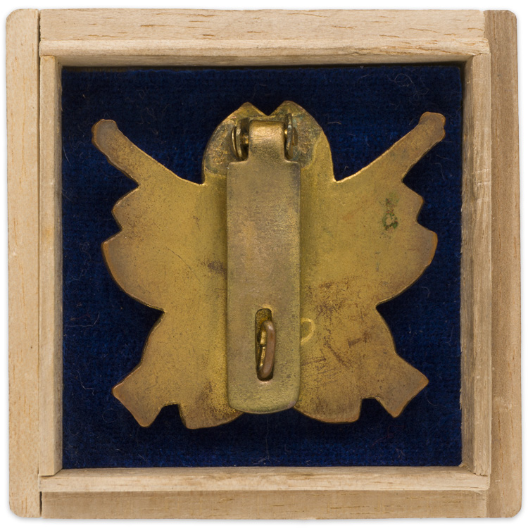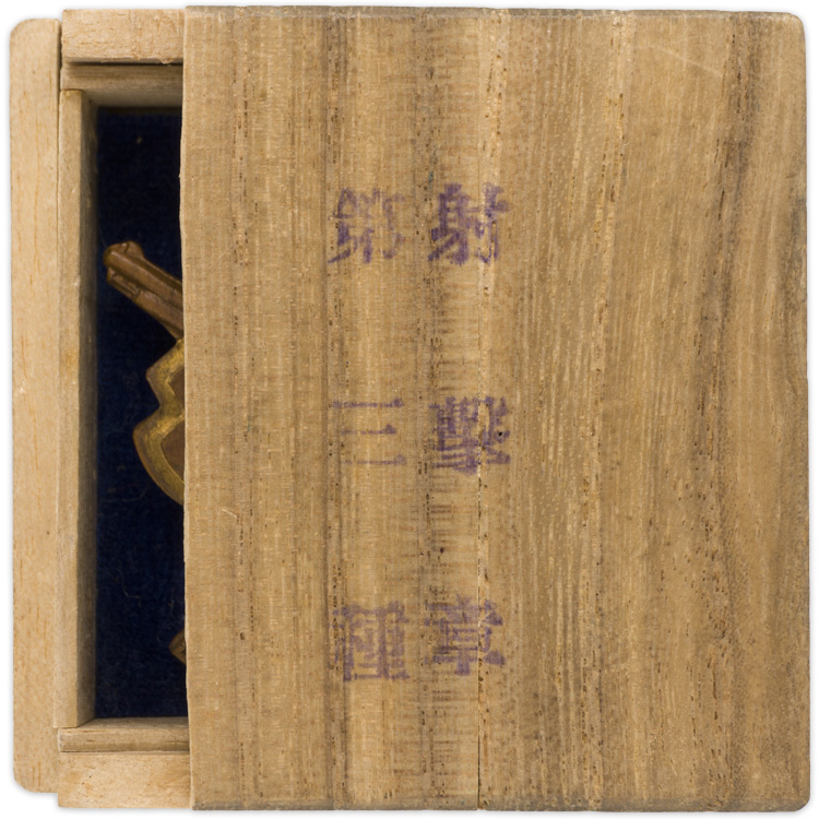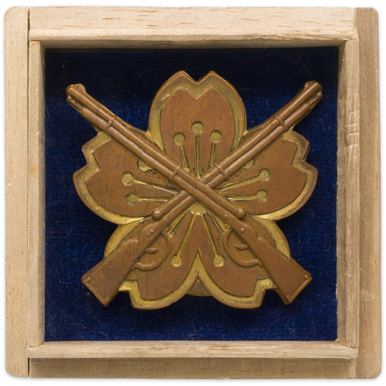 A bronze badge that takes the form of a convex five petal cherry blossom is 36cm across with crossed rifles in the foreground. The rifles and blossom are in bronze while the border of the petals is in gold. The reverse has a hinge with a broad flat pin whose perforated end mates with an "eye" on the flat backing. Complete with case. Case is missing a small section of the lid.