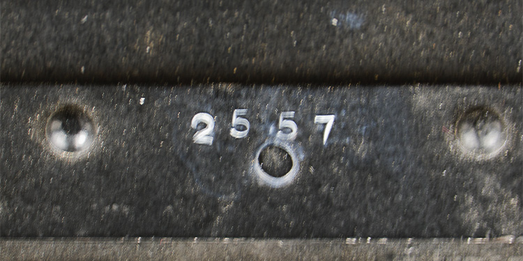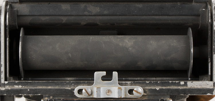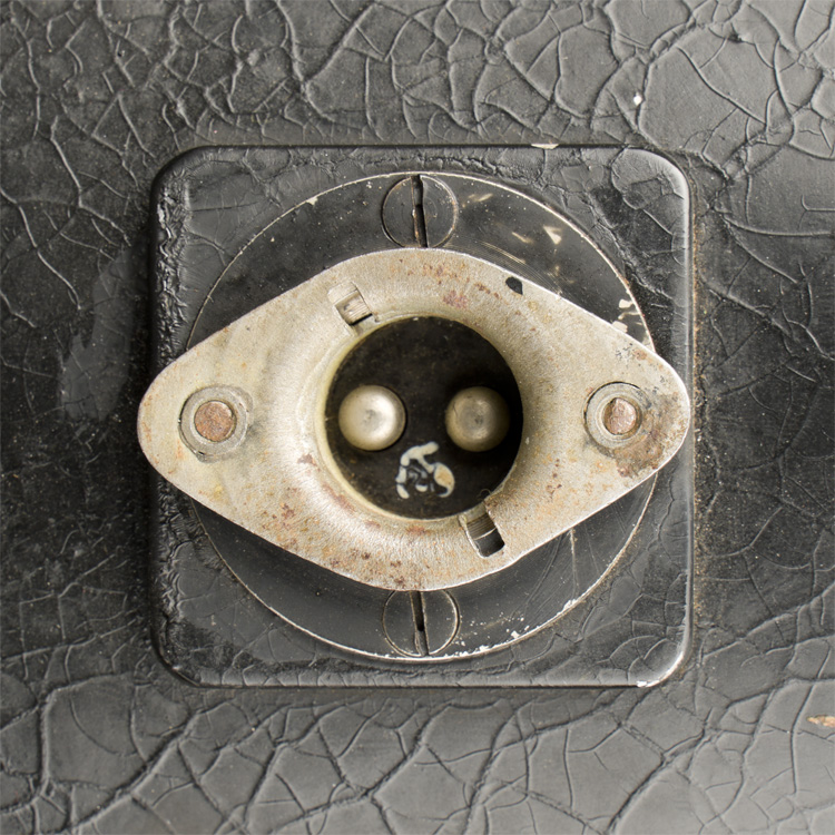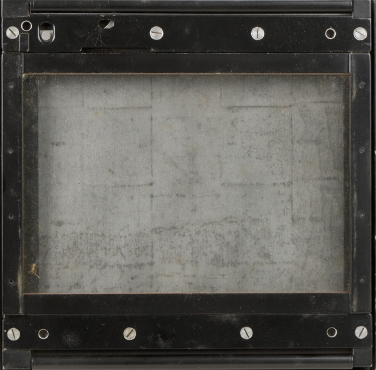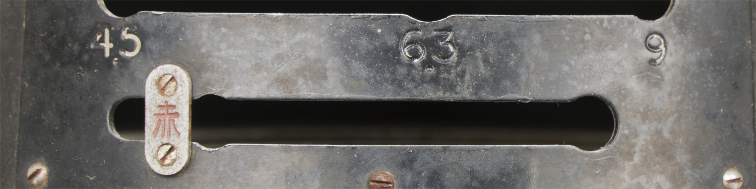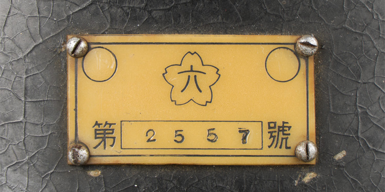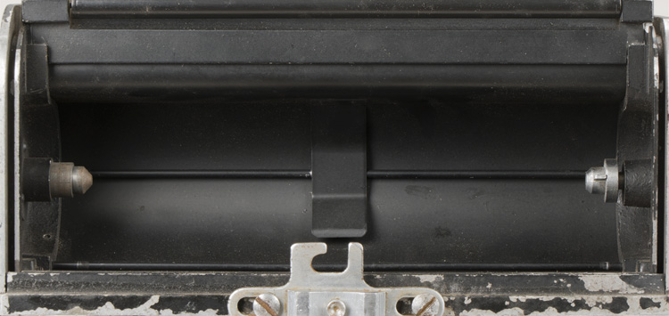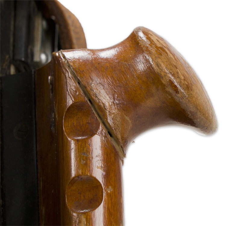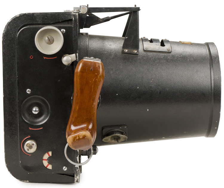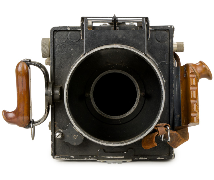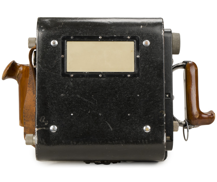 This second variant model camera was modelled after the U.S. Fairchild F-8 camera. It has a small white plate with the Rokuoh-sha or Konishiroku's logo (the character roku that is inside a stylized cherry blossom) and a serial number of 2557. The same serial number is to the inside of the rear panel. The levers that would adjust aperture to one of three positions (4.5, 6.3 or 9) are missing to the top of the lense behind the white plate. There is no lense or filters included. The wooden handles are intact with the knob to the left having been repaired with glue as the section had broken off at one time. The camera measures approximately 35cm long x 23cm wide back panel and 25cm high. Unsure of working order.