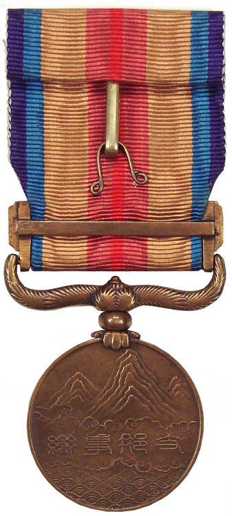 A medal, established in 1939 and awarded to Japanese soldiers departing for service in the undeclared war against China (hence, "incident"), with an accompanying photograph. The 1 3/16" diameter bronze medal features, to its obverse, the mythical giant crow "yata-no-karasu," flanked by two Rising Sun flags (for the Army and Navy), whose upwardly-stretched wings encompass a sixteen-petaled Imperial Chrysanthemum, with radiating lines as the backdrop. To its reverse are three stylized mountains above, and stylized water beneath, a cloud bank, against which is a row of four kanji characters, translating to "China Incident." The swiveling hanger connected to the top of the medal features abstract foliage as its pattern, and is itself connected to a swiveling, horizontal bar, through which the ribbon passes. To the front of this bar is a horizontal plate, upon which are embossed a row of four kanji characters, translating to "War Medal." The 1 1/2" wide, watered silk ribbon has a narrow, vertical red stripe to its center, flanked by wider pink stripes, then even wider stripes in yellow, then narrow light blue, and, to its outside edges, narrow navy blue stripes. These represent, respectively, loyalty, the blood-stained soil of China, the Army, the Air Force, and the Navy. The 2 1/4" tall ribbon folds over 1 5/8" of the way up, where the alloy hook to its uppermost edge then mates with an alloy eye sewn to the mid-point of its reverse. The ribbon is only lightly age soiled, and medal and its bar have the patina of old bronze to their recesses. This medal was awarded until the summer of 1945, and was abolished in 1946. The 2" x 2 7/8", black and white photograph is a head and shoulders portrait of a bespeckled, First Class Private (as is evident from the Type 98 rank insignia sewn to either side of the stand-up collar of his tunic), wearing a fur-lined, cold weather cap with fold-down ear flaps and with an encircled, five-pointed star sewn to its front. Pinned above the right breast pocket of his wool, Type 5 tunic is a pin which is also in the form of an encircled, five-pointed star. Both this model tunic and cap were used primarily during the early campaign in China. The background is indistinct. The reverse of the image has paper remnants where it had evidently been removed from an album. The photograph is age yellowed and lightly soiled, most noticeably to the upper left of its obverse.