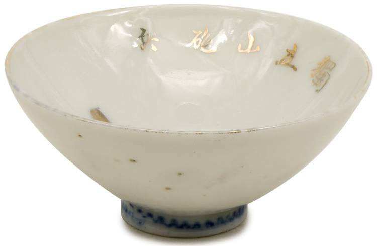 A white porcelain construction sake cup with gilt rim. The cup depicts an artillery cannon and artillery shells. The gilt kanji reads, "Dokuritsu (Independence), "Sanpo Hei" (Mountain Artillery), "Jotai Kinen" (Retirement Commemoration) and "Asakura" (The solider’s name). The cup has a diameter of 7.5cm.