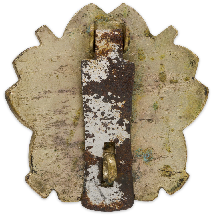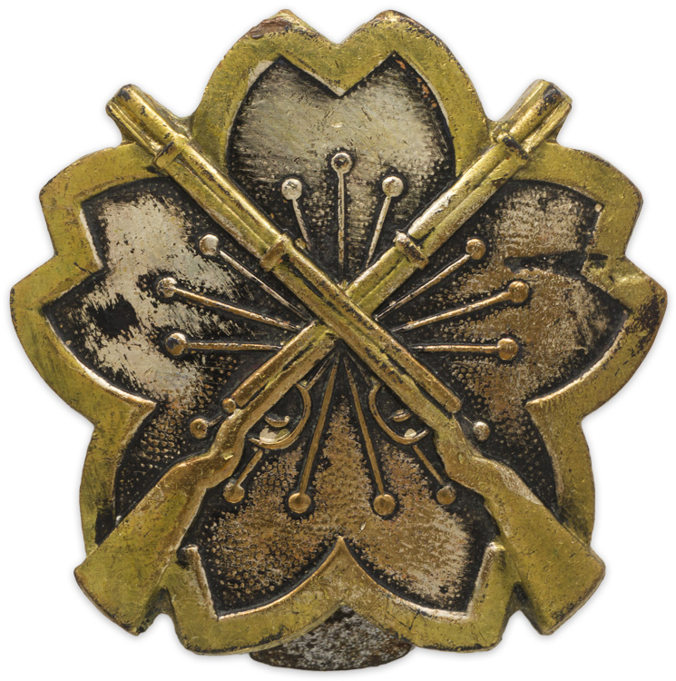 An alloy badge in the form of a convex five petaled cherry blossom, measuring approximately 40mm across with crossed rifles to the center of the pebbled background. The rifles and the border appear to be in gold gilt while the background is silver. A hinge with a broad flat pin, whose perforated end mates with an "eye." The back is featureless. The badge shows heavy usage and wear, but otherwise a nice used example.