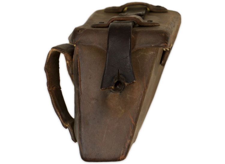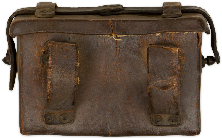 Standard issue, model 30 (1897) ammunition pouch as used by the Japanese army throughout the war. The 15cm x 10cm, dual pocket, rubberized canvas pouch originally would have held two groups of three five-round clips of 7.7mm ammunition. Hinged top flaps open outward and are each secured by a horizontal closure strap, with stud holes to each end, passing through vertical loops to the flap tops, and attaching to steel studs on either side of the pouches. Two vertical belt loops are sewn to the reverse (one of the loops has cracks and is fragile). The interior is separated into two compartments by a thick divider.