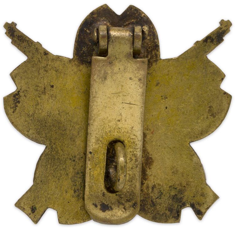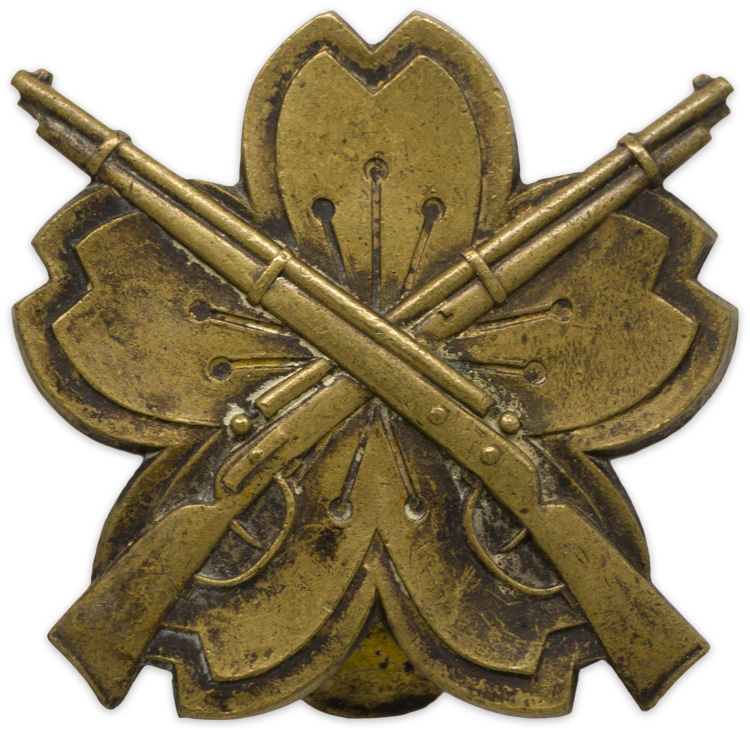 The alloy badge takes the form of a convex, five-petaled cherry blossom, 36mm from the end of one petal to another, with crossed rifles upon it. The rifles and the petals are in gold, while the borders of the petals, are in gold gilt. A hinge with a broad, flat pin, whose perforated end mates with an "eye," is to its otherwise featureless reverse. The badge shows heavy usage and wear, but otherwise this is a nice used example.
