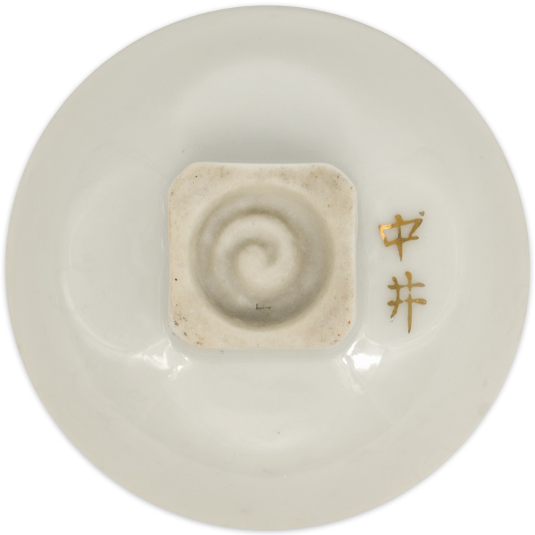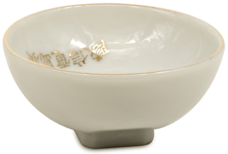 A white porcelain construction sake cup with gilt rim. The cup depicts an Army Signal Corps flag and a cherry blossom. The cup has a diameter of 6cm.