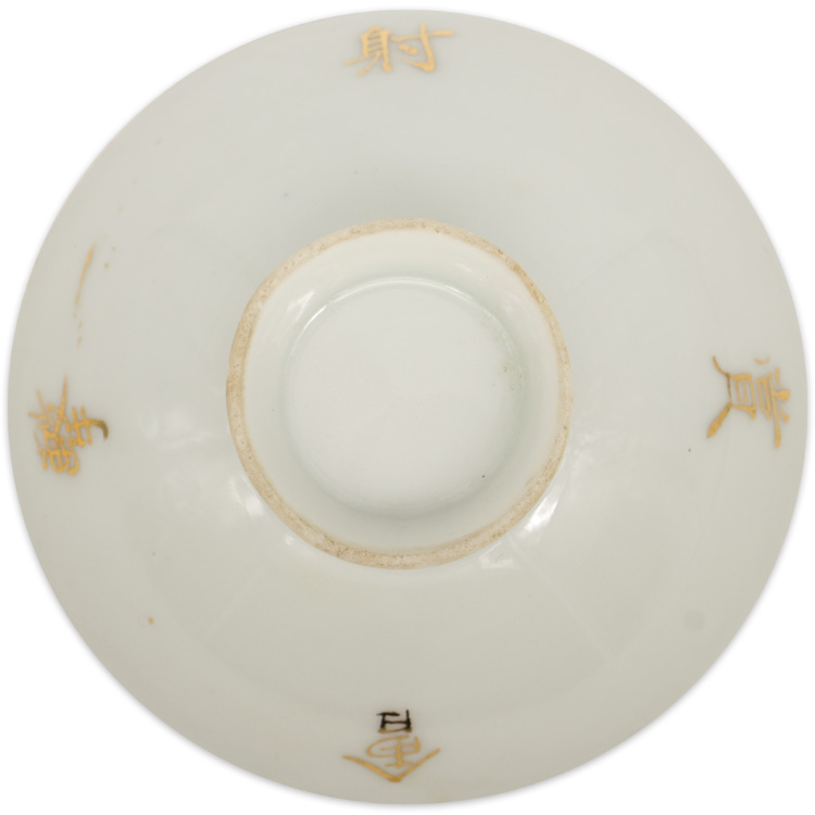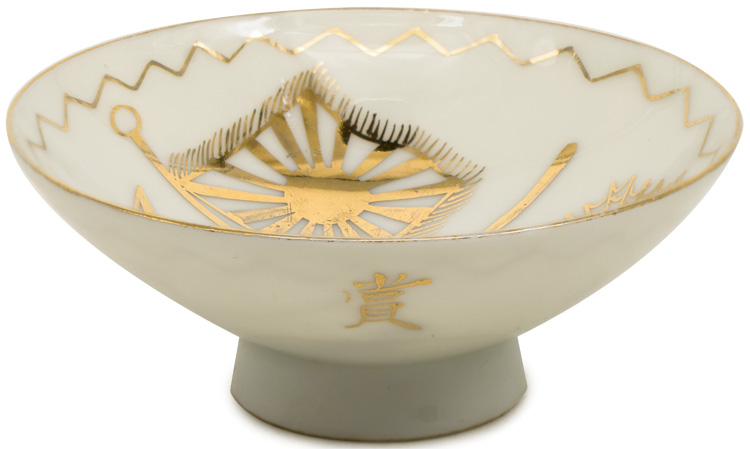 A white porcelain construction sake cup with gilt rim. The cup depicts an Army star above crossed Battalion and Regimental flags with a rising sun. The diameter of the cup is 8.5cm.