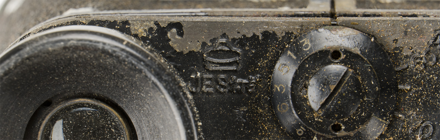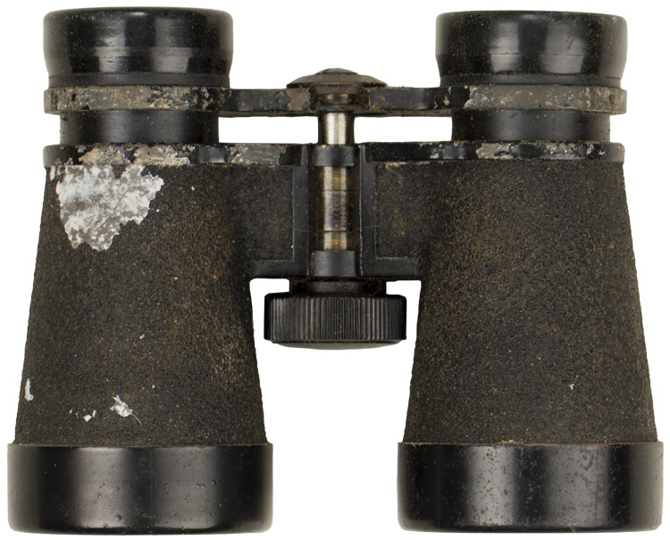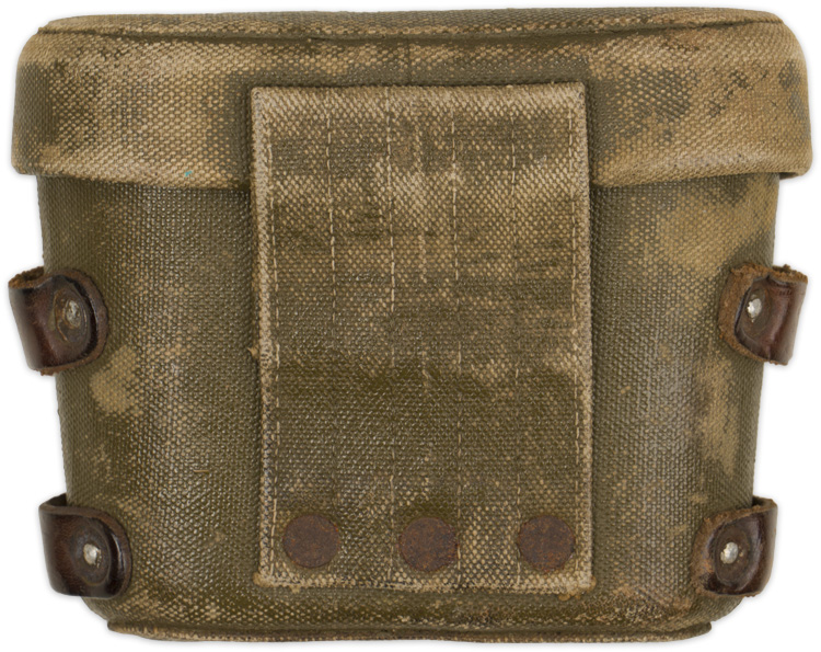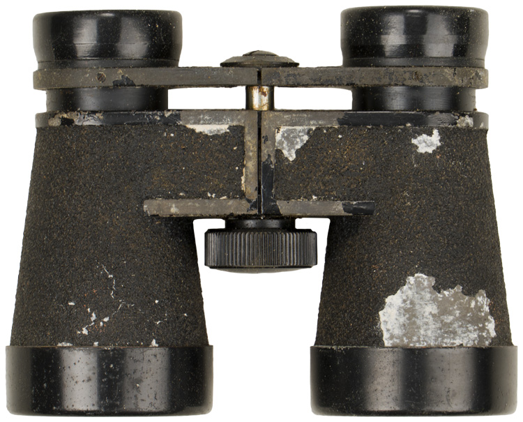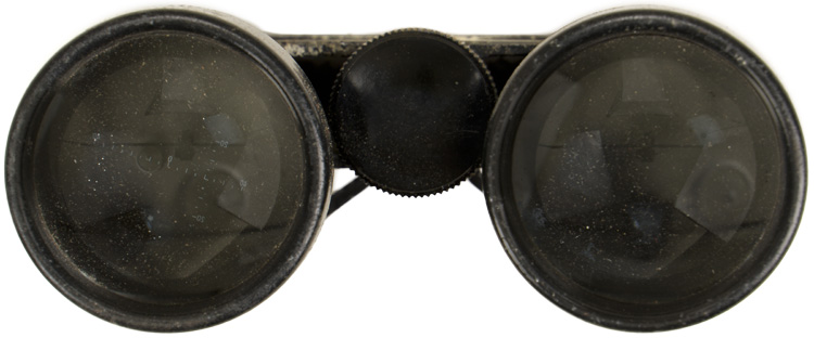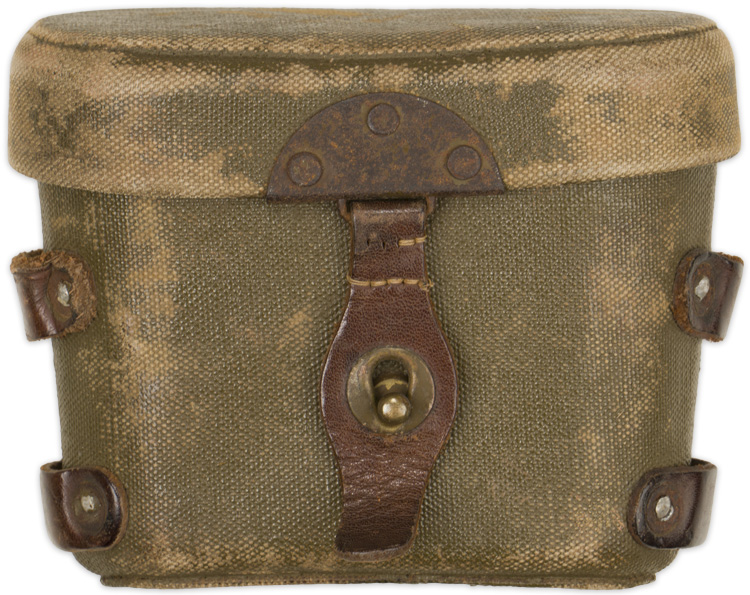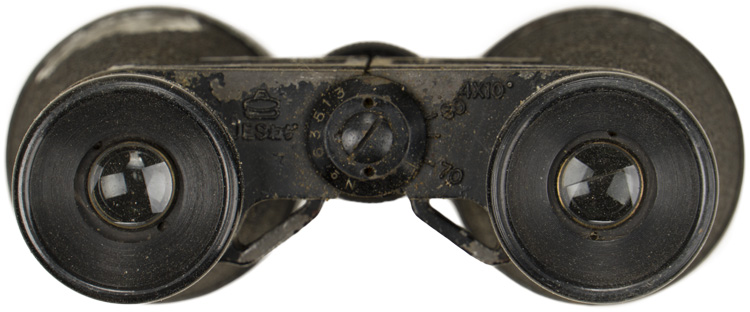 Cased, cast alloy binoculars, whose body is finished in a black, rough textured coating, with a black bakelite adjusting knob and eye cups. Beneath each of the eye cups is a collar whose extensions are connected to one another at a central post, to whose base is the adjusting focus knob. The surface of the left extension is embossed with the manufacturer’s logo, beneath which is "J.E.S." (Japanese Engineering Standard) followed by two kanji characters, and another character is stamped beneath that, no doubt an inspection mark. To the surface of the right extension is embossed "4 x (indicating the power) 10" (being the field of view in degrees), as well as gradations from "60" to "70" to the right of the center post’s dial, for adjusting the eye width. The dial has "No. 63513" stamped to it. Through the 7/16" diameter, right ocular lens may be seen a reticle pattern, graded for + and - 25 degrees along its vertical axis, and + and - 40 degrees along its horizontal. This is also visible, in reverse, to the 1 5/8" diameter, right objective lens. Unfortunately, the right ocular lens has a horizontal crack along its mid-point, making the upper half of the view through that lens consistently fogged. This is not, of course, as noticeable when looking through both lenses. The textured coating to the left housing has worn to its underside near the ocular lens, and to its top near the objective lens. Most of the paint along the edges of the collar above both housings has worn. Its case is made of rubberized, olive drab canvas, 4 1/2" in overall height, 5 1/4" wide at its top tapering to 4 3/4" at its base, and approximately 2 1/4" deep. Its stiff cover is triply rivetted along its reverse edge to a 2 1/4" wide belt loop, also of rubberized canvas, which is itself triply rivetted to the reverse base of the case. The forward edge of the lid has a semi-circular, triply rivetted plate to it, unto the metal loop to whose base is wrapped and sewn a brown leather tab, to whose widening center is a brass stud hole surround. This stud hole mates with the brass stud the front of the body of the case. Two horizontal leather loops are each doubly rivetted to either side of the case, for an, absent, hanging strap. The interior lid of the case is lined in padded canvas. Moderate chafe wear may be seen to its exterior, mostly to the edges of its lid, and all of its metal elements are heavily surface spotted.