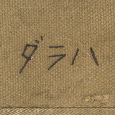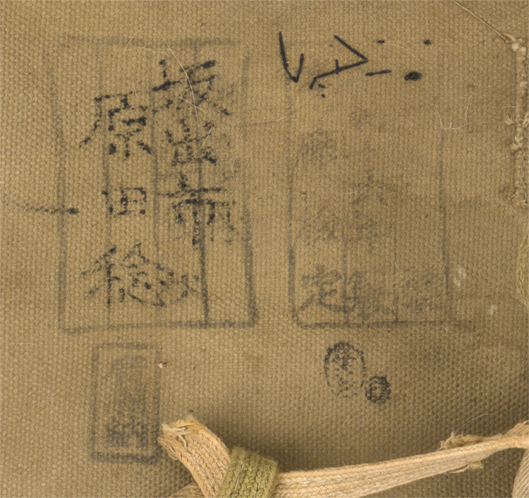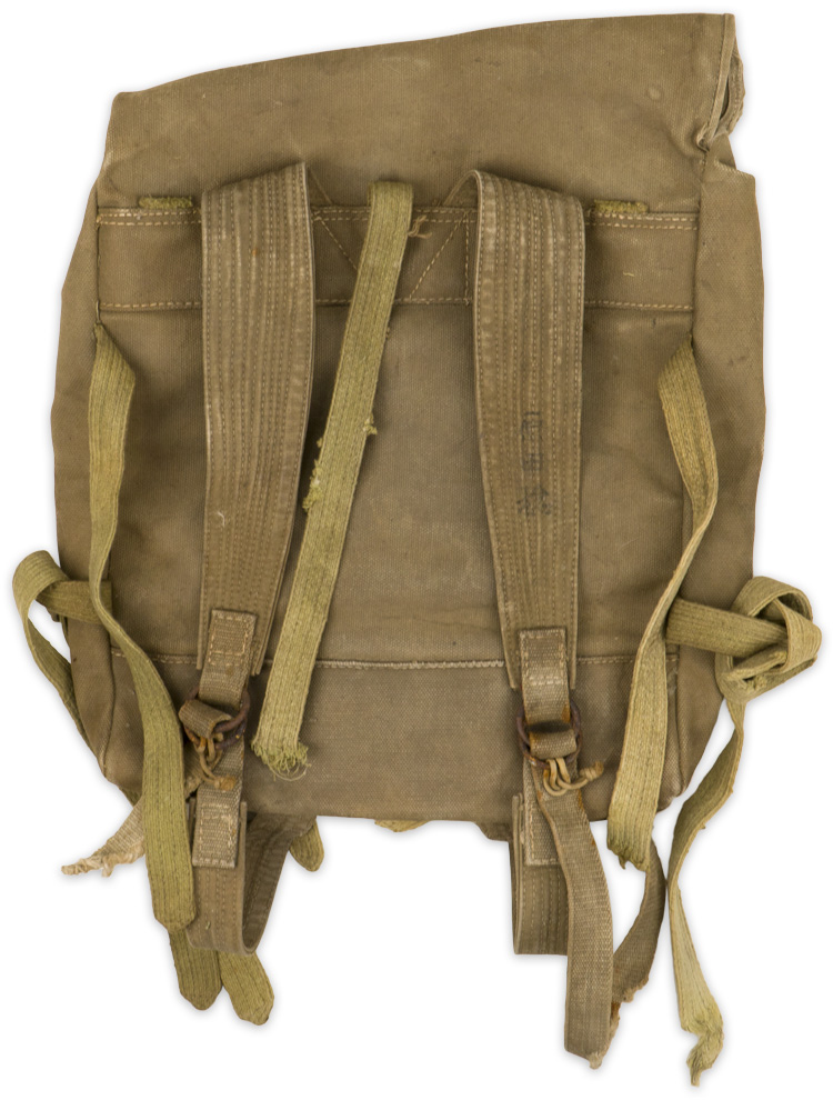 Introduced in 1938, the approximately 33cm x 29cm x 6.5cm, khaki-colored canvas knapsack features a top fold-over flap and a harness arrangement to the reverse comprised of two shoulder straps proceeding from each side of the upper back, and two narrower straps proceeding from each side of the lower back. To the ends of each of the shoulder straps, both of which have reinforced stitching, are sewn tabs with two brown-painted metal rings to them. The narrower straps to the base also have reinforced stitching to them, and even narrower straps sewn to their ends which pass through and adjust on the shoulder strap rings. Two long, narrow straps that would normally be alongside each of the shoulder straps are missing.. A narrow strap is sewn to the center of the upper back. Kanji markings can be seen under the flap with hand stitch kanji. Shows moderate/heavy usage and wear.