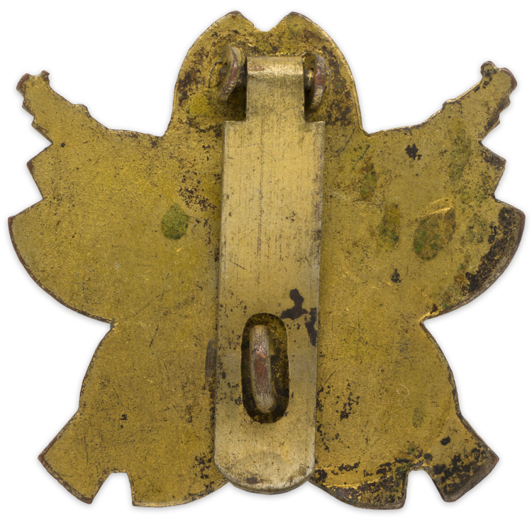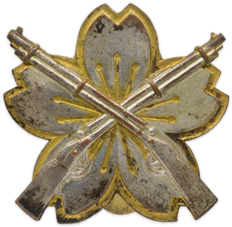 The alloy badge takes the form of a convex, five-petaled cherry blossom, 36mm from the end of one petal to another, with crossed rifles upon it. The rifles and the petals are in silver, while the borders of the petals, and the lines radiating out from their center, are in gold. A hinge with a broad, flat pin, whose perforated end mates with an "eye," is to its otherwise featureless reverse. The badge shows light/moderate usage and wear, but otherwise this is a nice used example.