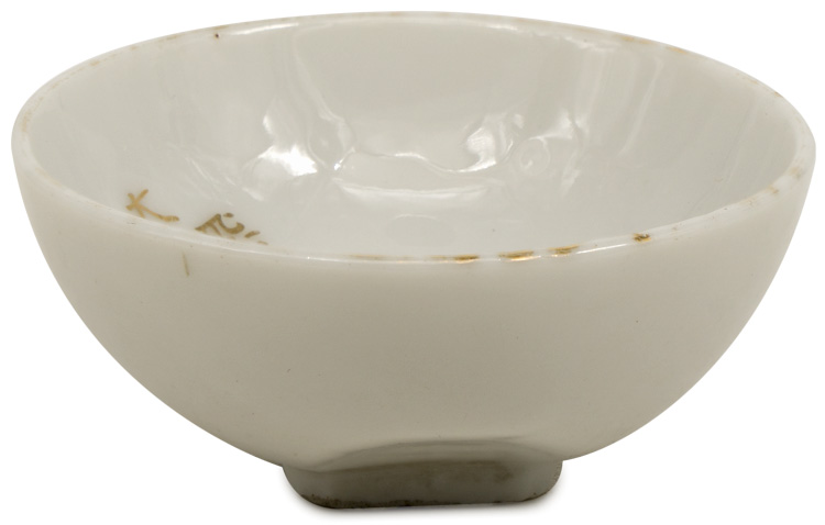 A white porcelain construction sake cup with gilt rim. The cup depicts a bi-plane surrounded by gilt kanji. The cup has a diameter of 6cm.