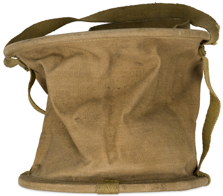 A 28cm diameter, canvas collapsible water bucket that was attached to the backpack. The bucket measures approximately 28cm high with a rigid bottom and opening. Kanji is stamped to the bottom of the bucket.