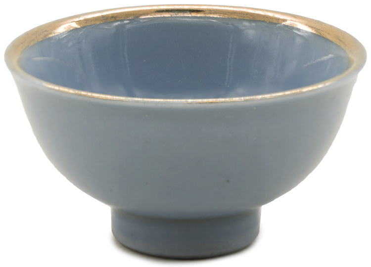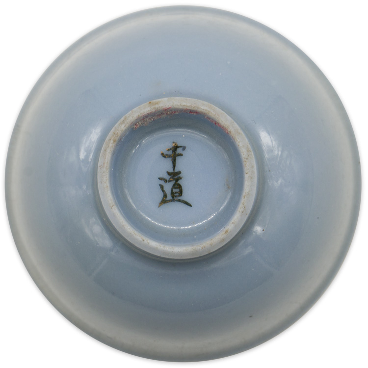 A blue porcelain construction sake cup with gilt rim. The gilt kanji represents the 5 Imperial teachings. The cup was awarded to a soldier named, "Nakamichi". The diameter measures 5.5cm in diameter.