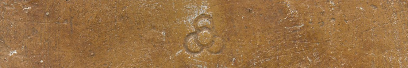 A brown painted, aluminum 540ml canteen with webbed harness, and a cork stopper with aluminum cap and eyelet. The leather strap that would have extended through the eyelet to the body via buckles is missing, which led to the owner using a cord to attach the stopper to the body. The shoulder strap is torn in half. Markings are visible to the bottom of the canteen. Of Note: This model of canteen is also known as the "Sake Bottle Canteen".
