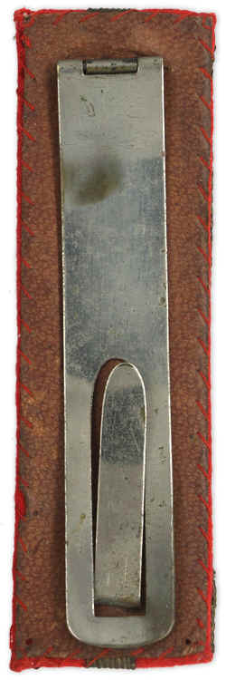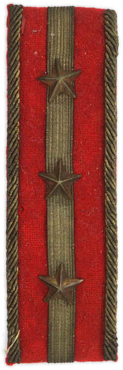 The "Type 5" (5th year of the Showa era, or, 1930) rank insignia were worn on the shoulders of the uniform, as that model’s stand-up collar featured the arm of service colors and regimental numerals. Red wool edged with gilt wire embroidery, between which runs a gold-colored stripe, with three, gilt-washed brass, five-pointed stars affixed along its center. This configuration distinguished the wearer as being a Captain. Backed in olive drab wool with original hinged clasps.