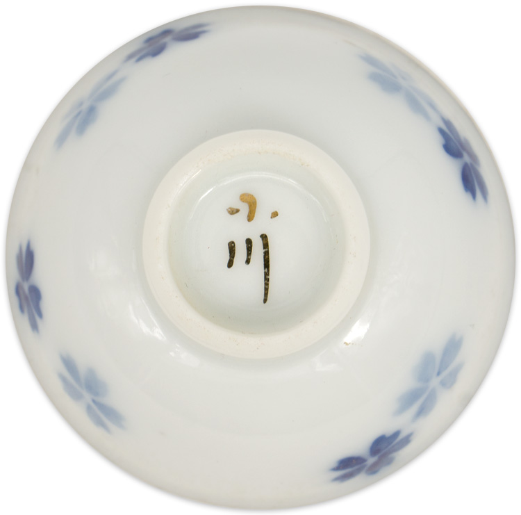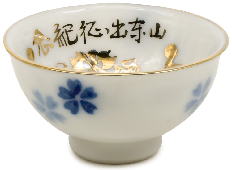 A white porcelain construction sake cup with gilt rim. The cup depicts crossed Hinomaru and Rising Sun flags below an Imperial Guards crest with a Railroad symbol. The gilt kanji reads, "Shussei" (Deployment) and "Santou" (China). The cup has a diameter of 5.5cm. It is very rare to find a cup with an Imperial Guard marking as well as a Railroad symbol.