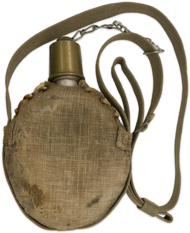 Original cover, lace-up string, chain & cap. Aluminum construction. Nice complete untouched Japanese Navy canteen.