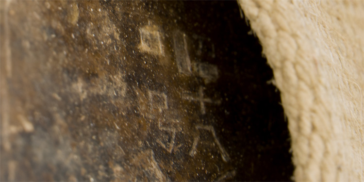 A black painted aluminum canteen with a wood stopper and webbed carrying harness. A leather strap passes through the "eye", each end of which has buckling holes which mate with the buckles to either end of the webbed harness. The khaki-colored webbed harness is comprised of two horizontal bands which encircle the bottom and the middle of the canteen, and are connected by a vertical band which is sewn to both their centers and runs underneath the canteen. Vertical bands are also sewn along both sides, whose attached, extended tabs terminate in the aforementioned buckles. The actual end of one of the side bands forms the over-the-shoulder strap, whose other end folds back around itself through a metal sliding adjustment buckle and retaining loop. The formed loop to the latter end in turn feeds through a "D" ring which is attached to the short end of the other side of the harness. The canteen is marked to the bottom. The wooden stopper has a crack to it, but remains strong. The leather strap is cracked and a bit dry and fragile at the buckle ends.