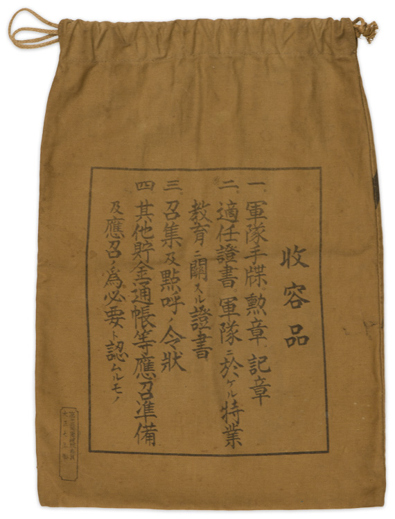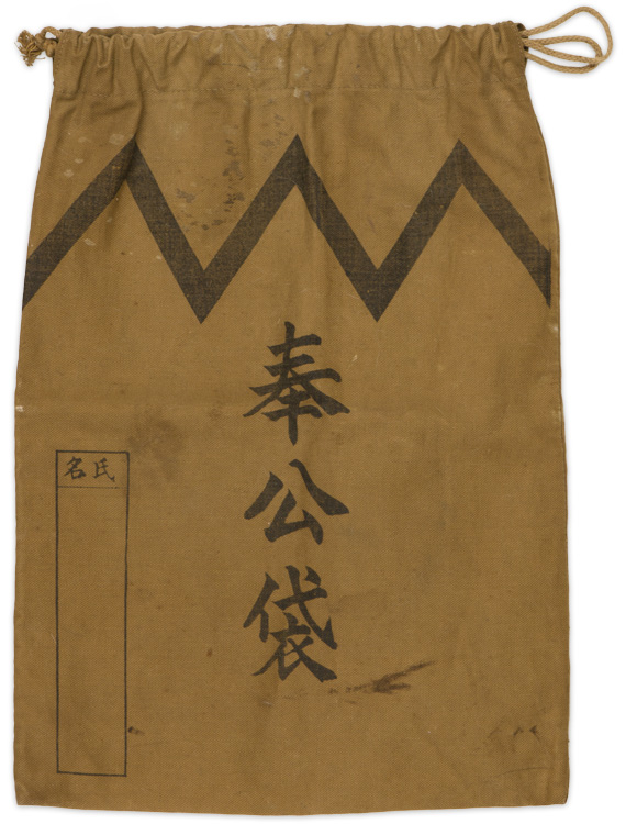 A "houkoubukuro" or Public Service bag, has printed to the reverse a list of contents/items that were to be carried that included a military notebook, decorations/awards and insignia, certificate of competence, training or education, call up papers and other necessary pass books, etc. The bag measures approximately 24cm x 34cm with drawstring opening.