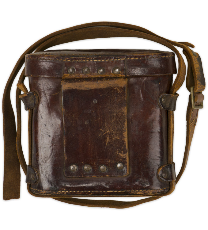 A leather binocular case with a leather hinged lid. The leather strap extends around the body of the case that is secured by a single prong buckle. The strap has torn.