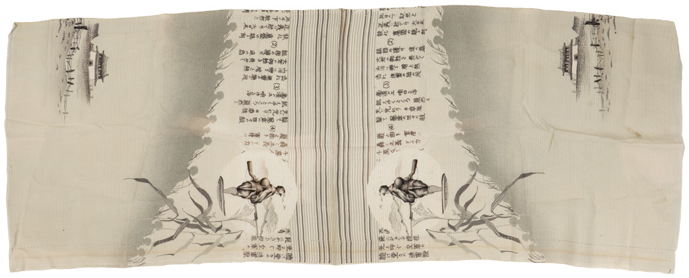 A 36cm x 100cm, printed covering. The design folds back onto itself. Stitch holes can be seen along each side, as well as along the bottom. I believe it is a towel or covering. There is some fraying to the bottom edge.