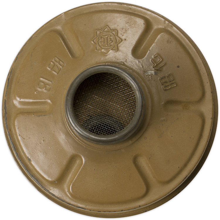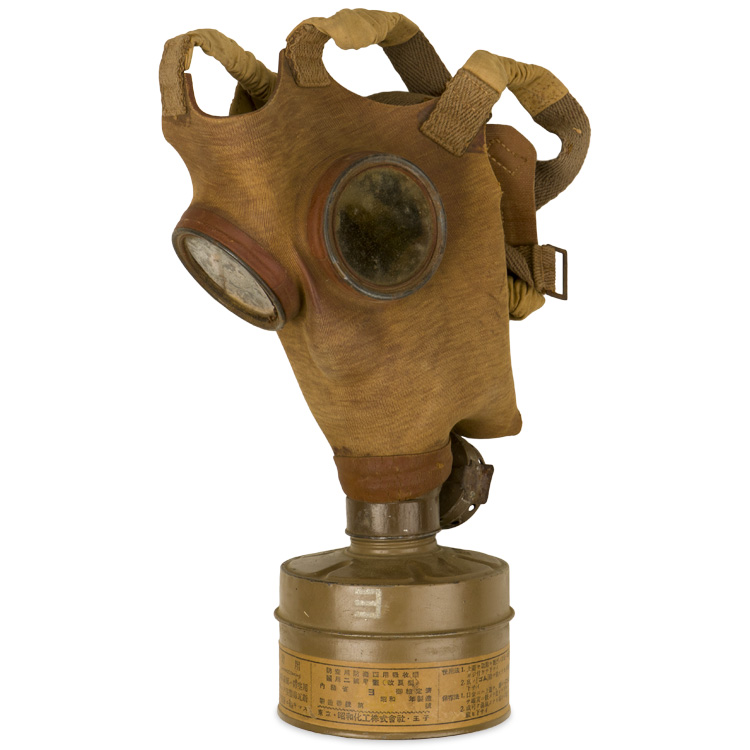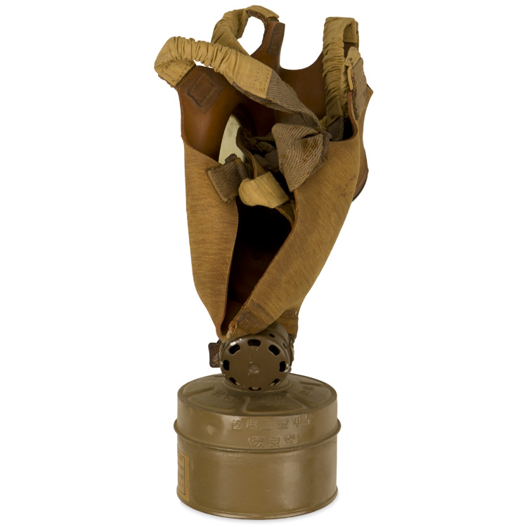 A two piece gas mask with face mask and canister that attached directly onto the face mask. The original plug is in place at the bottom of the cannister. The mask is partially dry, but remains supple. The glass to one rimmed lense is discoloured and crazed. The Type 99 pouch, is not specific to this type of gas mask. It measures approximately 8cm x 23cm x 25cm with adjustable carrying strap and ties to secure to the body. The interior is divided into two sections. There is a reinforced stitched hole to the bottom of the bag and a small printed label sewn to the bottom right corner on the front panel. The carrying pouch shows staining, as well as wear that has caused some holes to the fabric.