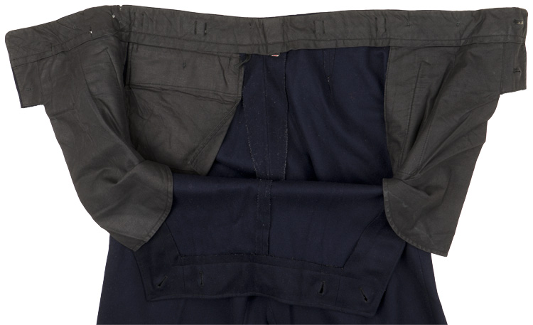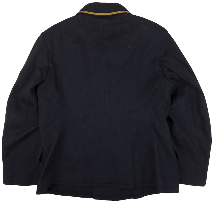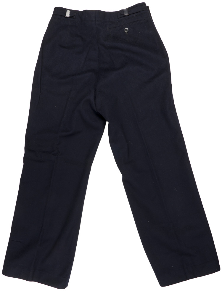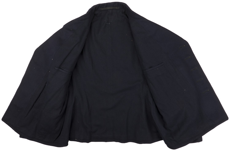 PHYSICAL DESCRIPTION: Nice quality, Kriegsmarine era, deep navy blue doeskin wool construction, three quarter length, double breasted style jacket with fold back peak lapels and a lay down collar. Jacket features two, vertical, parallel, rows of five front closure buttons with corresponding button holes on the left front panel. The fold back peak lapels also have a single button hole to each with a corresponding button hidden beneath each lapel. Right breast has a machine embroidered national eagle in golden yellow threads on a cut-out navy blue wool base. The eagle is neatly handstitched to the jacket. Jacket has two horizontal slash front hip pockets with straight edged flaps. Sleeves have straight cut non-adjustable cuffs. The upper left sleeve has a 1940 pattern specialty insignia consisting of a machine embroidered exploding winged shell situated above a single chevron in bright red threads on a vertically oval navy blue wool base indicating light Flak Artillery specialist. The oval navy blue wool base is handstitched to the sleeve and interestingly has an underlaying stiffener. Lay down collar has the typical zig-zag reinforcement stitching to the reverse. The forward edge of the collar is trimmed in gilt wire, NCO’s rank tress and has plain, cornflower blue wool collar tabs with a small strip of the gilt wire, NCO’s rank tress near the top edge. Tress signifies the rank of Obermaat. Collar tress and tabs are machine stitched to the jacket. The interior of jacket is fully lined in navy blue melton cloth with grey rayon sleeves. Lining has a horizontal slash pocket to both left and right breast panels and heavy internal padding to each shoulder. Lining has faint illegible white inkstamp within a boxy "T" shaped outer border. Although illegible the inkstamp is from one of the Kriegsmarine clothing depots. Jacket shows small areas of light to moderate nap wear, a small handstitched repair and about a dozen small moth nips which are only visible on close inspection. All the buttons are the fire gilted alloy type with embossed fouled anchor on a horizontally ribbed field with simulated twisted rope outer border and most appear to have their original stitching. The reverse of all the buttons have impressed script, "Kriegsmarine" and dates of "1938", and, "1939". Jacket is roughly size 40" chest. Set comes with a nice pair of size 32/34 trousers.